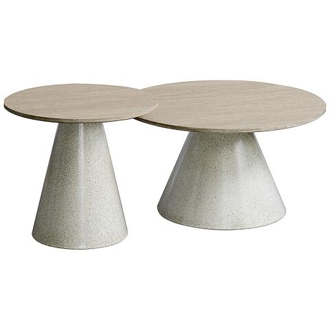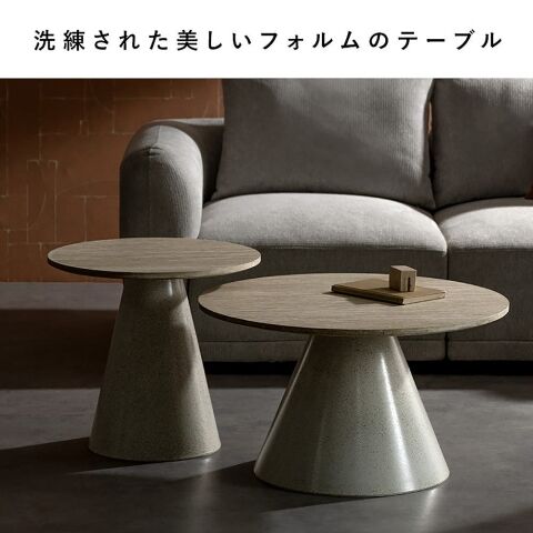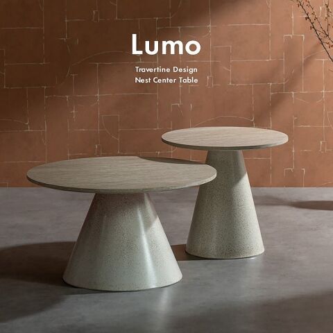 ◆不規則な穴や縞状の独特な模様の天然石トラバーチン(石灰岩)を模した天板と円錐デザインが印象的なネストセンターテーブル『Lumo(ルモ)』。