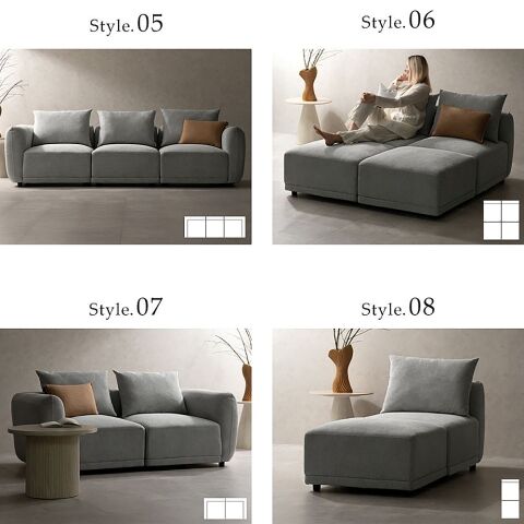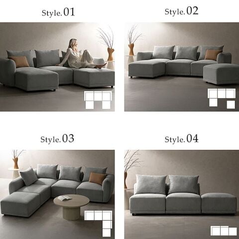 ◆肘掛けのあるコーナーソファ、中央に置けるアームレスソファ、オットマンから置く場所や座る人数に合わせて様々なパターンができます。