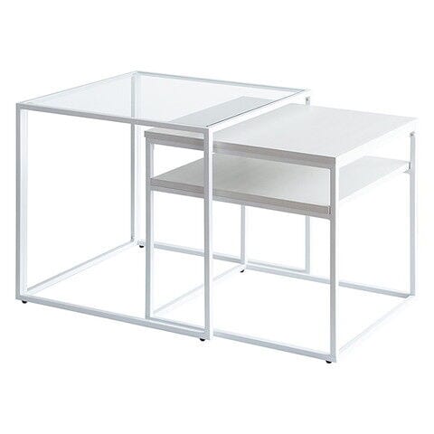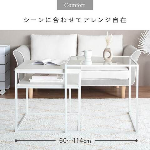 ◆美しいガラス天板のテーブルと棚付き木製テーブルは重ねたり切り離したり、自由なレイアウトが可能です。
