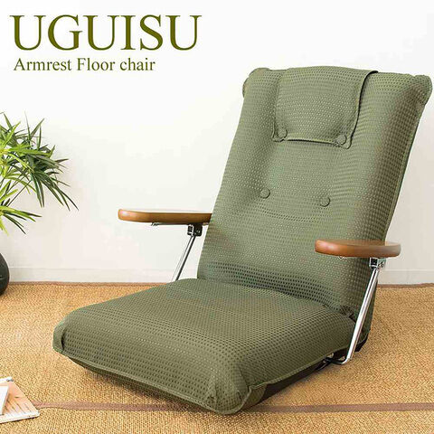 ◆簡単に跳ね上がるポンプ式の肘置きがついた、落ち着きのあるベーシックな座椅子『UGUISU(うぐいす)』。