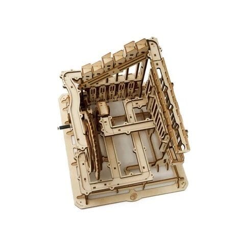 手回しのハンドルで、スチール球が転がって行く様子をエンドレスに楽しめます。