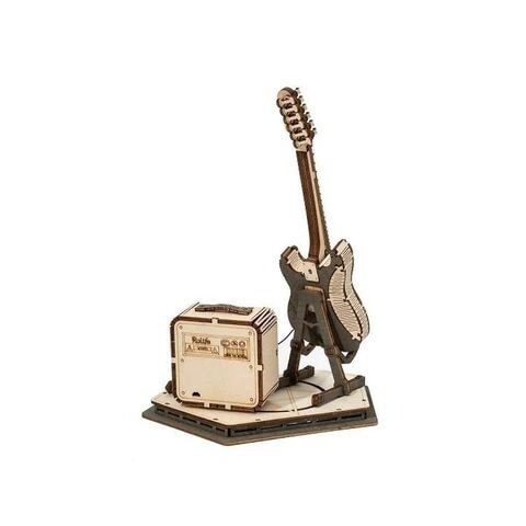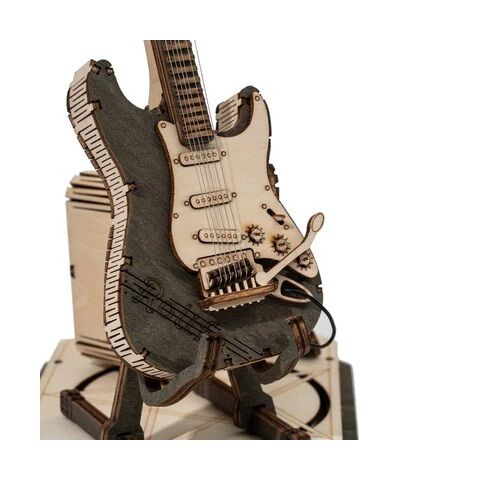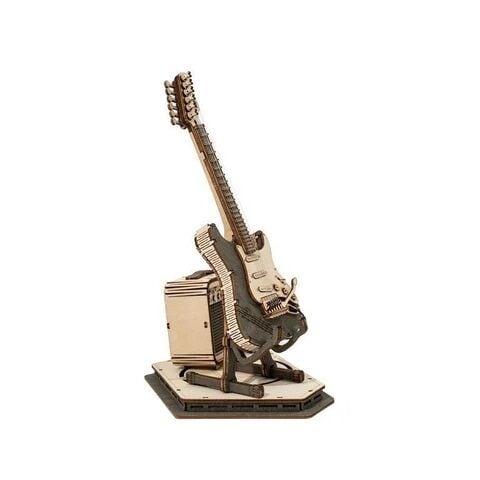 弦やアンプのコードに別素材を使用し、蛇腹パーツによってエレキギターの複雑なフォルムが再現された、完成度の高いウッドパズルです!