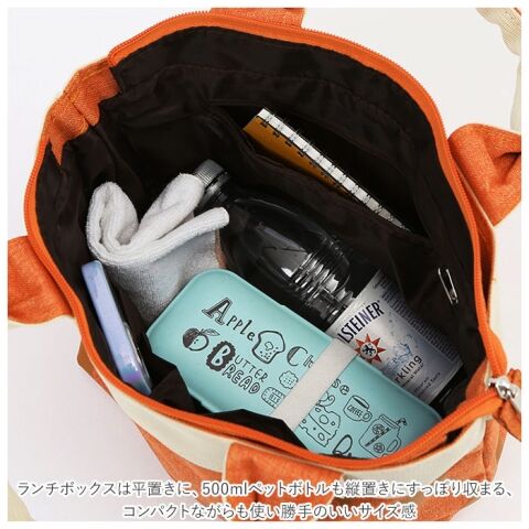 ランチボックスは平置きに、500mlペットボトルも縦置きにすっぽり収まる、コンパクトながらも使い勝手のいいサイズ感。