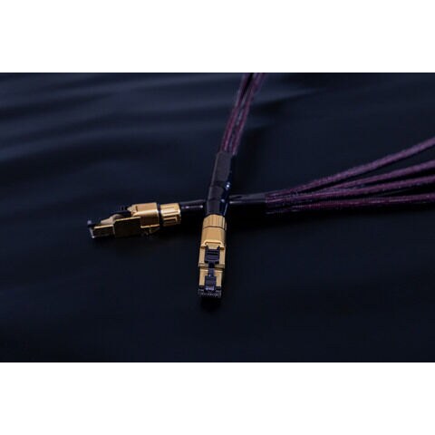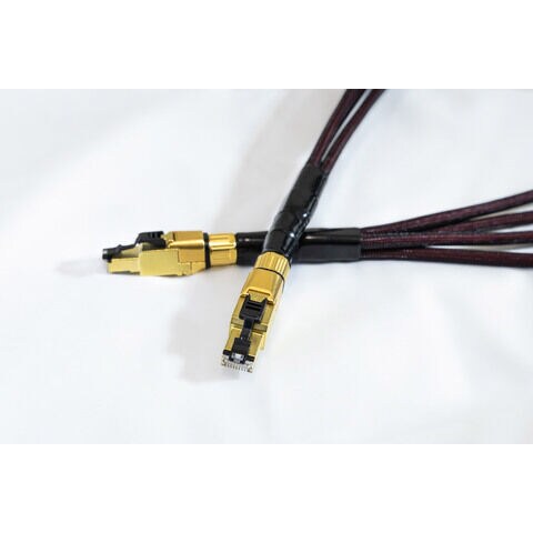 導体には世界初の音響専用鍛造導体PC-TripleC、絶縁材には比誘電率と誘電正接に優れたテフロン、介在には静電気の発生を防止する天然シルク、シースには貴陽石とトルマリンを含浸させて帯電防止、LAN(RJ45)端子にはテレガードナーの最高級銀メッキバージョンを採用するなど、伝送特性と音質を高めるための贅を尽くした部材をフル投入しています。