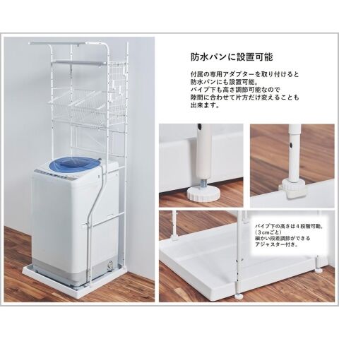 ◆上段にあるパイプはTシャルやタオルを掛けるのに便利。幅と高さを調節できる便利なランドリーラック