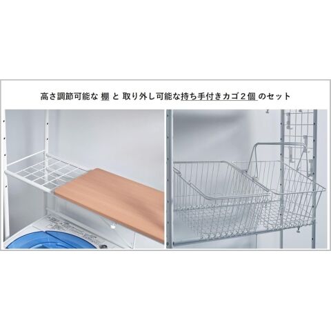 ◆カゴの高さは、使用シーンに合わせて調節可能。棚板はPVC仕様で防水性があります