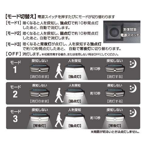 [モード1] 暗くなると人を探知し、強点灯で約10秒間点灯したあと、自動で消灯します。