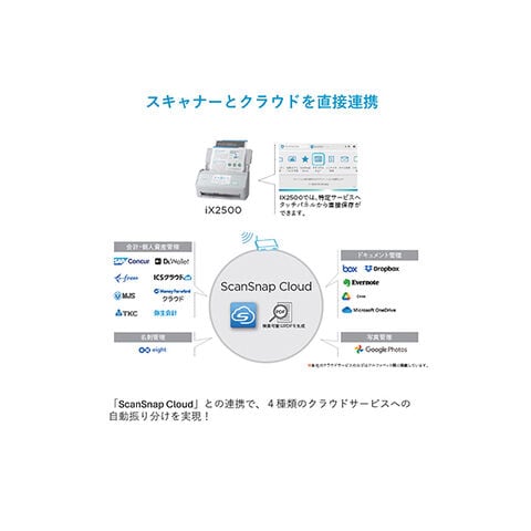 ScanSnap 本体から直接各種クラウドサービスにスキャンデータを送信できるサービス「ScanSnap Cloud」を通じて、文書管理や名刺管理、会計サービスへPC無しで直接連携できます。