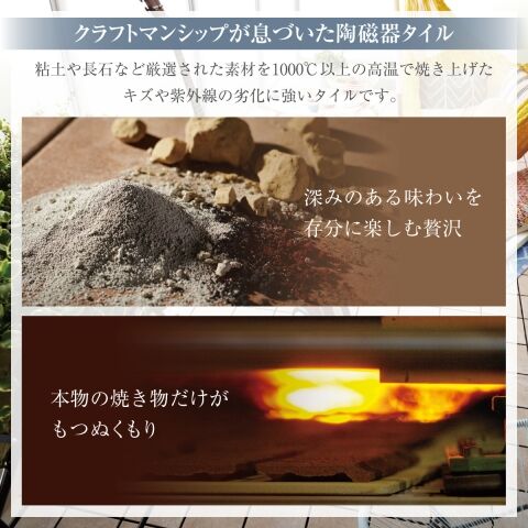 粘土や長石など厳選された素材を1000度以上の高温の窯で焼き上げられた陶磁器タイルです。本物の焼き物だけが持つリアルヴィンテージのような表情に加えて、クラフト感にこだわった手触りや温かみが特徴です。TOTOのクラフトマンシップが息づいた、その温もりあるバーセアをご堪能ください。そして1枚1枚異なる色合いが深みを醸し出し、こだわりの空間を演出します。
