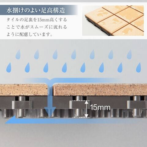 タイルの足裏は15mmと高めに設計されているため、雨水や水道水がスムーズに流れていきタイル上に水が溜まらないく水はけの良さがポイント。バーセアの脚は下地を傷めないように丸みのある面取りしています。さらに脚が90本と大量にあることで荷重を分散させて負担軽減に繋がります。タイルの各辺も面取りしていることで、角に脚が当たっても躓きにくいよう配慮しました。