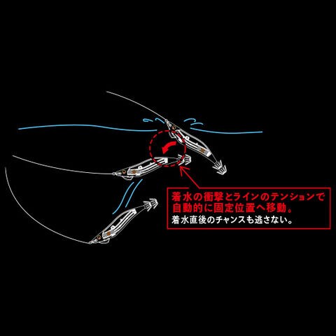 着水の衝撃とラインのテンションで自動的に固定位置へ移動。