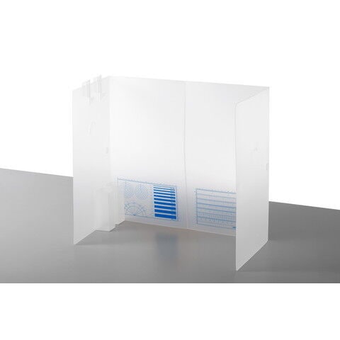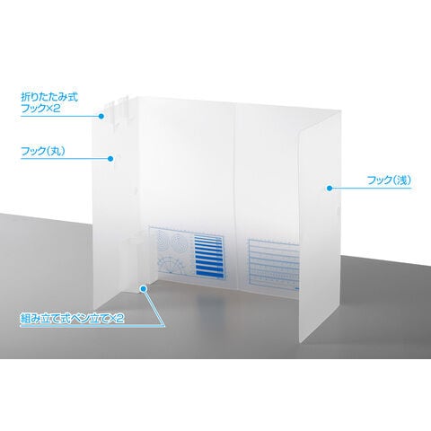 設置時の高さは約45cm。パーツの切り出し時に飛びがちな切りくずや、パーツ自体の飛散防止に役立ちます。 展開時の幅は約51cmと、A3サイズのカッティングマットや大きめのキットの箱なども置いて作業可能。 本体正面に作業の目安になるガイドラインと目盛を印刷。パーツを当ててサイズや角度を計測するのに便利です。 側面に2種類のフックを加工。キットの組立時、使用頻度の高いランナーなどを吊り下げたり、シールをはさんで置いたりすることが出来ます。また、マスクなどの軽いものを吊り下げておくのにも便利です。 製品本体は丈夫なポリプロピレン製。手元が暗くなりづらい半透明素材。 モデリングシールド同士は本体の面ファスナーで、横に連結して使うことも出来ます。 本体上部に引っ掛けられる折りたたみ式のフックと、組み立て式のペン立てが付属。