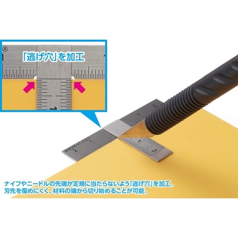 ・切断作業の際、ナイフやニードルの先端が定規に当たらないよう、交差部分に「逃げ穴」を加工。 刃先を傷めにくく、材料の端から切り始めることが可能。