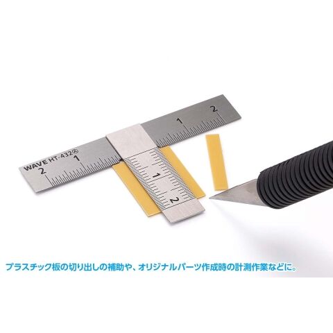 ・プラスチック板の切り出しの補助や、オリジナルパーツ作成時の計測作業などに便利なT定規です。