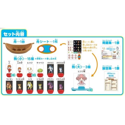 船:1台 舟シート:1枚 駒(大):3個 駒(小):15個 問題集:1部 解答集:1部