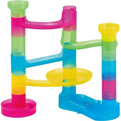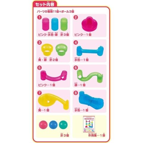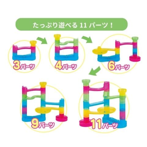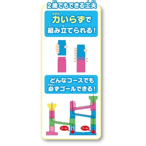 つみつみスロープは、2歳のお子さまでも自分でコースを作ることができ、ボール転がし遊びが楽しめる玩具です。