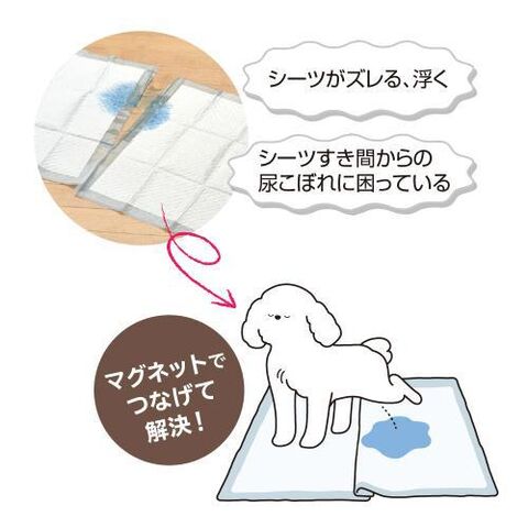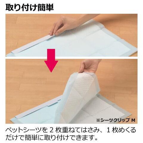 ペットシーツを2枚重ねてはさみ、1枚めくるだけで簡単に取り付けできます。