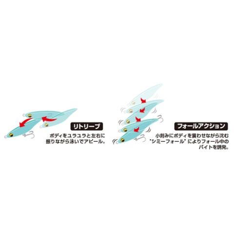 ・フォールアクション:小刻みにボディを震わせながら沈むシミーフォールによりフォール中のバイト誘発。