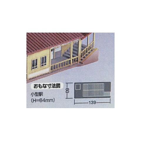 製品はグレーの成型色(未塗装) 対向式ホームの駅に見られる、平屋建ての駅舎のキットです。 駅前の売店やポスト、電柱パーツなども付属します。 別売りの都市型対向式ホームセット(No.2131)と組み合わせることができます。