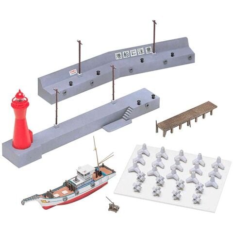 製品はグレーの成型色(未塗装) 先端に小さな燈台のある防波堤(直線部×1本、屈曲部×1本)、木造の小桟橋、木造漁船(1隻)、陸揚げに用いる小さなウインチ(通称:おかぐらさん)、波消しブロックなどの詰め合わせセットです。 本セット1箱で、レイアウトにのどかな小漁港が再現できます。 漁船用の大漁旗はじめ、漁港の雰囲気を盛り上げる各種看板のデカールが付きます。