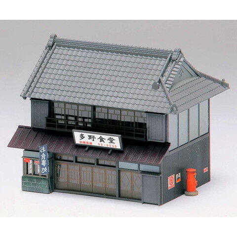 入母屋根・出桁(だしげた)造りの商家が1棟製作可能 壁面はダークブラウン成形(一部白印刷・白塗装済み)、屋根はダークグレー成形 窓ガラスは窓枠、扉が印刷済み 看板、のれん、のぼり旗、ホーロー看板などはステッカーに付属 円筒形の郵便ポストが1基が付属(未塗装)