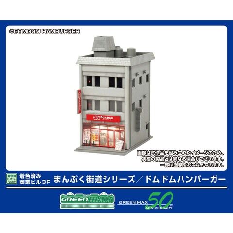 グリーンマックスのNゲージ用ストラクチャー、着色済み 商業ビル 3F まんぷく街道シリーズ/ドムドムハンバーガー(組立キット)です。