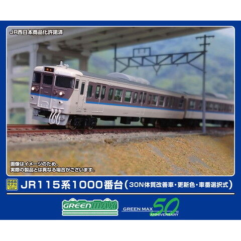 グリーンマックスのNゲージ車両 完成品、JR115系1000番台(30N体質改善車・更新色・車番選択式)基本4両編成セット(動力付き)です。