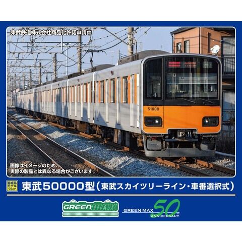 グリーンマックスのNゲージ車両 完成品、東武50000型(東武スカイツリーライン・車番選択式)基本4両編成セット(動力付き)です。