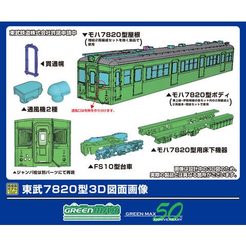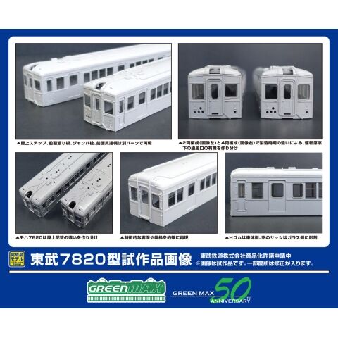 東武7820型セイジクリームカラーの晩年の姿を完全新規金型にて再現 車両番号は付属する車両マークから、種別板・行先板は付属するステッカーからそれぞれ選択可能 車両番号、社名、乗務員室立入り禁止は付属する車両マーク(新規製作)からの選択式 ステッカー(新規製作)が付属し、前面種別板、前面行先板、シルバーシートを収録 避雷器、ランボード、屋上ステップ、前面渡り板、ジャンパ栓、前面貫通幌はユーザー取付け ベンチレーターは取付済み ヘッドライト(電球色)、テールライトが点灯(編成の中間に入る車両は一部非点灯) フライホイール付きコアレスモーター動力ユニット搭載 車端部付きロングシートパーツを実装 オリジナル記念冊子が付属