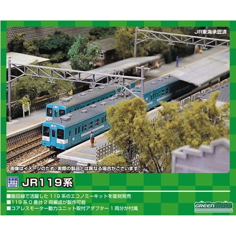飯田線で活躍した119系のエコノミーキットを復刻発売 119系0番台2両編成が製作可能 ボディはグレー成形、床下機器は黒色成形 付録としてクモハ119用床下機器(カバータイプ・黒色成形)が付属 コアレスモーター動力ユニット取付アダプター1両分が付属