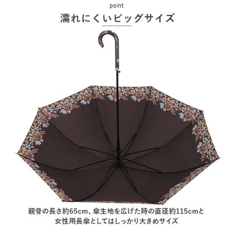 ◆親骨の長さ約65cm、傘生地を広げた時の直径約115cmと女性用長傘としてはしっかり大きめサイズ。肩に掛けたバッグやコートの裾も濡らしにくい嬉しいサイズ感。