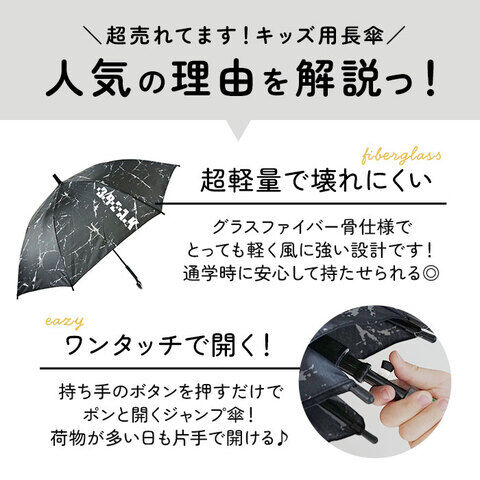 落ち着きのあるカモフラパイピングや、傘生地の1コマにエンブレムを配置したスピードスター柄など、男の子らしさがキラリと光るクールなデザインで、お友だちの傘と差をつけちゃおう!