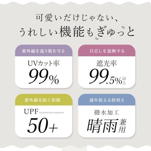 傘生地の内側にはブラックコーティング加工を施し、UPF50+、UV99%カット、遮光率99.5%以上!