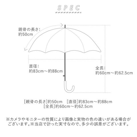 - サイズ(約):[適応身長]110~135cm [親骨の長さ]50cm [直径]83~88cm [全長]60~62.5cm [収納時の長さ]38cm [収納時の幅]8cm