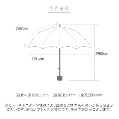 - サイズ(約):[親骨の長さ]50cm [直径]91cm [全長]52cm [収納時の長さ]23cm [収納時の幅]5cm