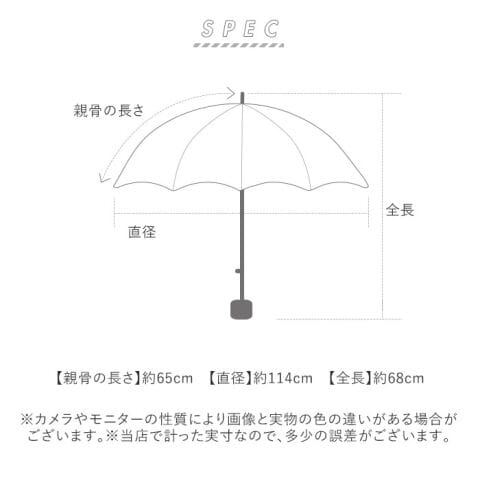 - サイズ(約):[親骨の長さ]65cm [直径]114cm [全長]68cm [収納時の長さ]32cm [収納時の幅]8cm