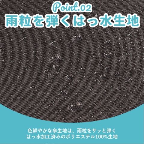 色鮮やかな傘生地は、雨粒をサッと弾くはっ水加工済みのポリエステル100%生地。