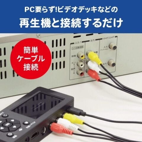 本製品をコンセントにつなぎ、ビデオデッキやビデオカメラなどの再生機とケーブル接続するだけ。パソコン、専用ソフトのインストールは不要です。