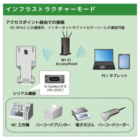 RS-WF62はWi-Fi経由で離れた場所にあるシリアル通信機器を、制御・管理できるシリアルインターフェイスです。コネクタには、EIA/TIA-232-F 規格対応のD-Sub 9Pin を採用しており、RS-232C機器とWi-Fi接続で通信が可能です。