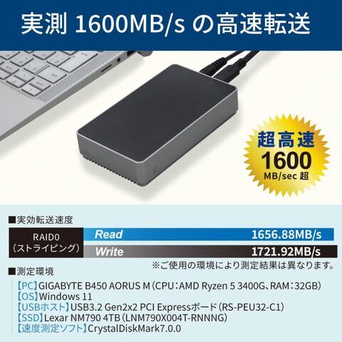 RAID0(ストライピング)で、USB3.2 Gen2x2(20Gbps)の性能を存分に発揮。実測1600MB/sの高速転送を可能にします。