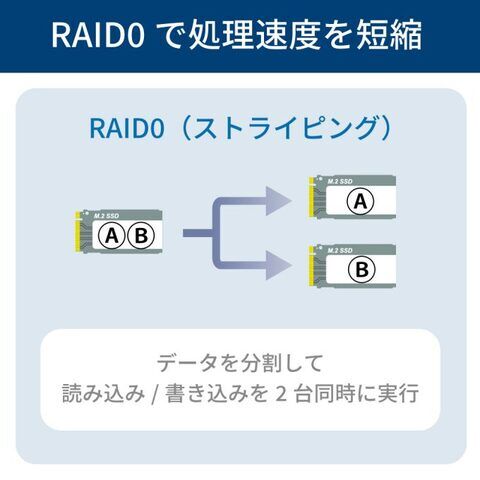 データを分割し、書き込み/読み込みを2台のSSDで同時に実行。データの処理速度を短縮することができます。