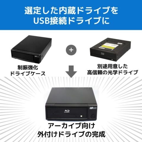 企業のデータアーカイブには、信頼性が不可欠です。本製品は内蔵光学ドライブを格納し外付けで利用できる、制振設計のUSB3.0ドライブケースです。