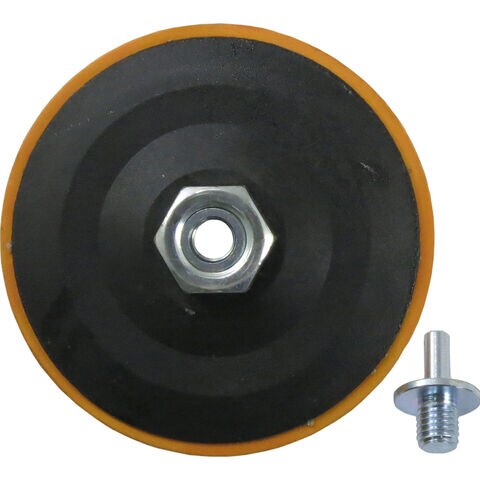 ◆ディスクグラインダーへの取付けは本体のナット部分で取付け可能。電気ドリルへの取付けは付属のマンドレール(軸径φ6)をパッドにねじ込み、その軸を取り付けて下さい。