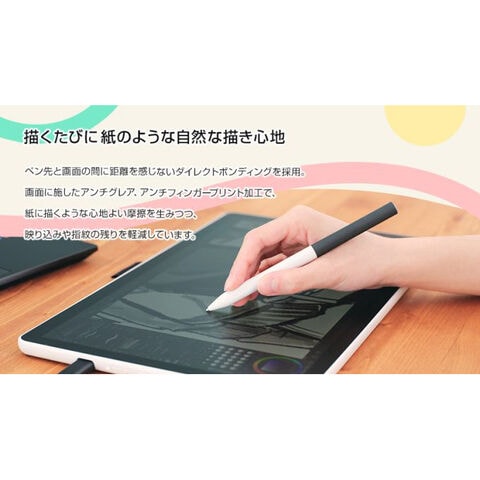 映り込みや指紋を防ぐ加工(アンチグレア、アンチフィンガープリント)と、視差を軽減してくれるダイレクトボンディング加工により、描くたびに紙のような自然な描き心地が味わえます。