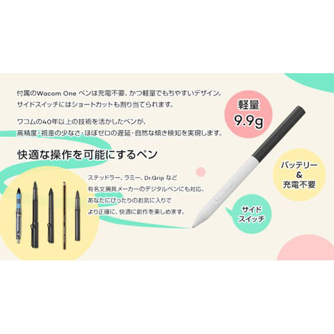 付属のWacom Oneペンは、充電不要、かつ軽量で持ちやすいデザイン。