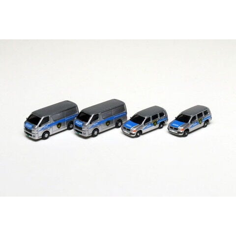 警備会社用の車両をイメージした側面の青帯とロゴが特徴。プロボックスはナンバープレートが白、ハイエースは緑色 ハイエースは後部座席部分の窓が塞がれた輸送用仕様 ヘッドライト/テールランプやグリル、バンパー、ドアハンドル、ホイールカバー、ナンバープレートを塗り分け ハイエースロング(標準ボディ幅・標準ルーフ)×2台、プロボックス×2台の4台入