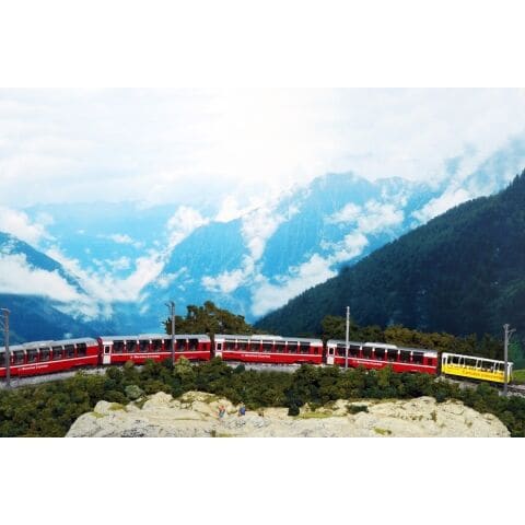 「ベルニナ急行」はスイスのクールからイタリアのティラーノを結ぶ観光列車で、車体肩部にかけて優美な曲線を描くパノラマガラスの側面窓が特徴的な客車列車です。
