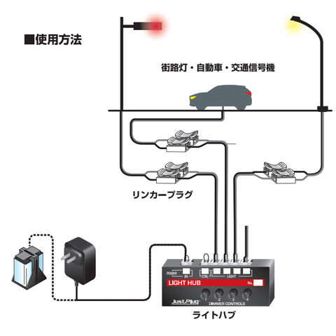街路灯などのアクセサリーの配線や、自作のライトの点灯に使用します。 リンカープラグのコード中継プラグはバネ式の接点プラグで、ハンダ付などの工作は必要ありません。