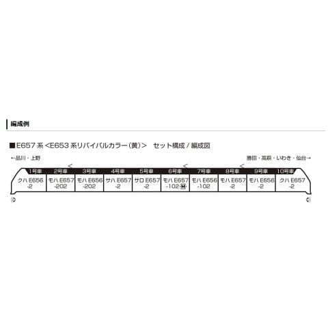 [ クハE656-2 ] + [ モハE657-202 ] + [ モハE656-202 ] + [ サハE657-2 ] + [ サロE657-2 ] + [ モハE657-102(M) ] + [ モハE656-102 ] + [ モハE657-2 ] + [ モハE656-2 ] + [ クハE657-2 ]