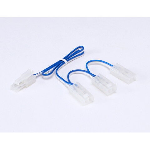 1台のパワーパックから最大3か所へ線路や制御機器、ストラクチャーの照明などへの給電が可能 分岐部分をケースに3口収めた構造からからコネクター3つをコードで繋げた構造に改め、各コネクターの向きを柔軟に変更可能 分岐コネクターのケーブルの長さは30cm 通電容量はユニトラック用に適合した定格16V3A 外観は青白のコード。制御機器などに使用されている茶白・赤黒コードへも使用可能